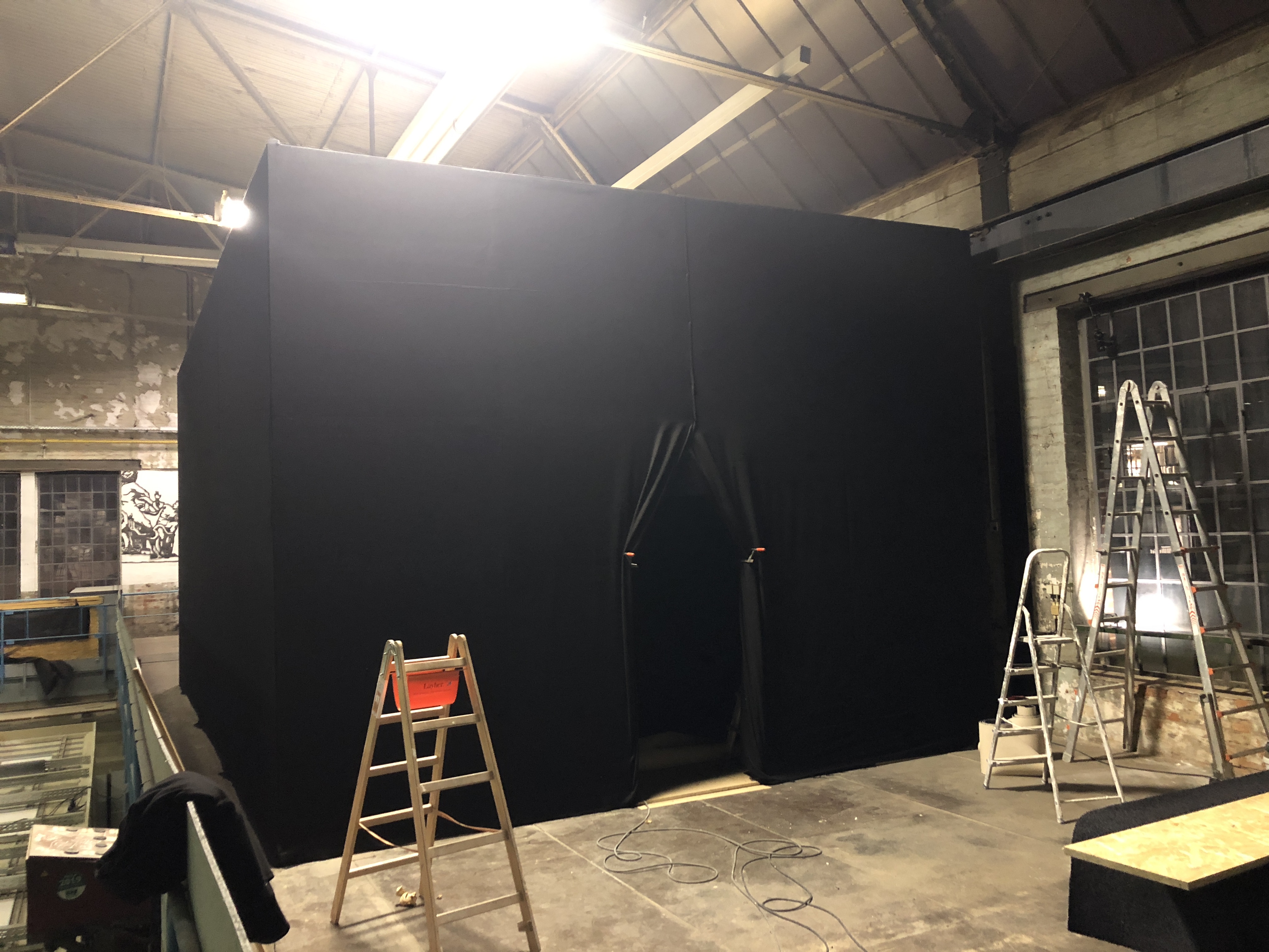 In order to separate the sound design of the machine from the noisy sarod recording (due to the fan system inside CERN), the decision was taken for 5.1-sound, and to keep the sarod alone in the centre speaker for greater separation. The centre speaker was replaced with a guitar speaker in order to narratively plant the noise but also enhance the reference of a performance. The six channel sound composition was mixed on location for its main exhibits at Schering Stiftung Berlin and Halle 9 in Leipzig. For the opening at Schering Stiftung a dedicated 5.1 PA system was developed based on 12” co-axial cinema speakers and an 18” sub woofer.